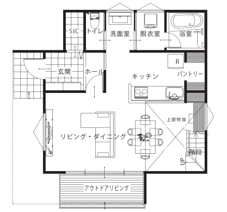 アウトドアリビングの上部に奥行きの深いL型庇があることで、雨を防ぎ太陽の光をコントロールします。夏の日差しが室内に直接入らないことで省エネ効果が高まります。