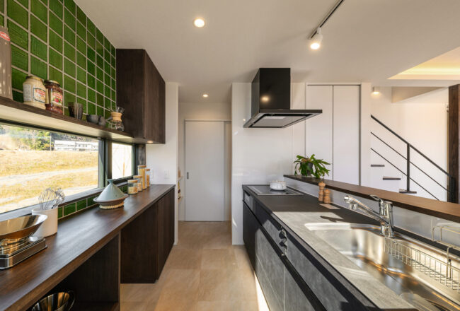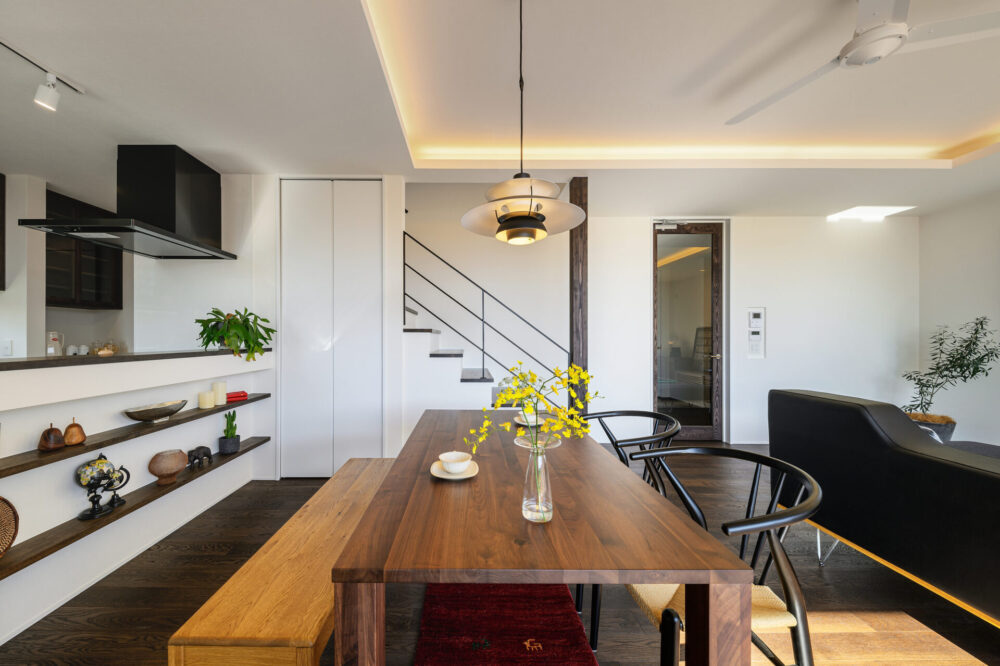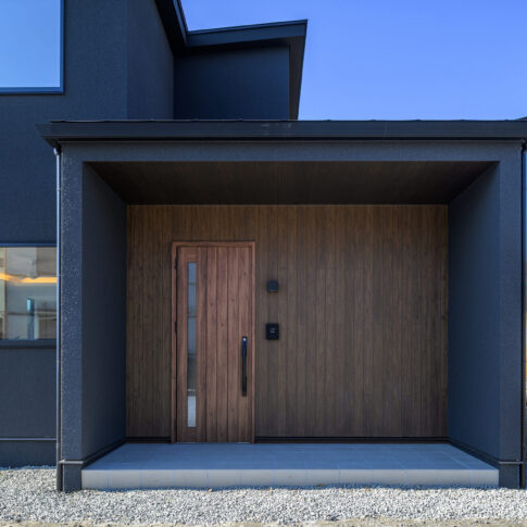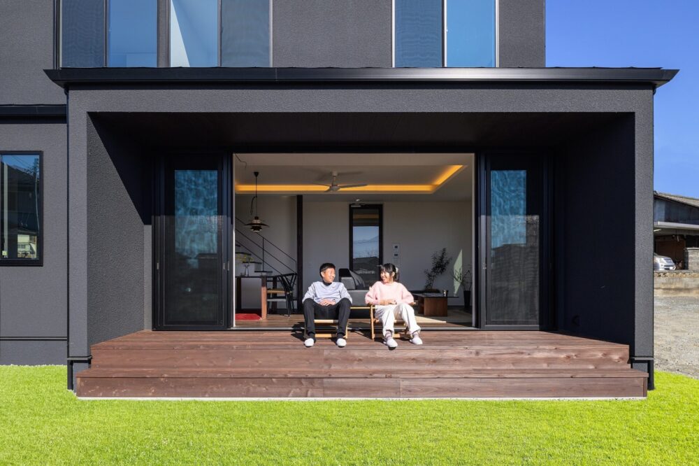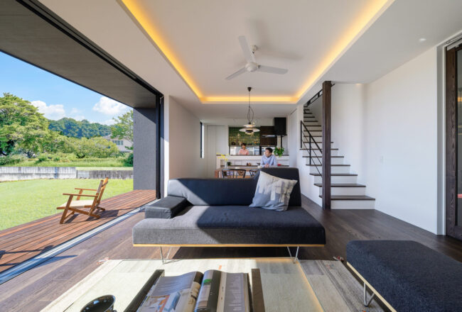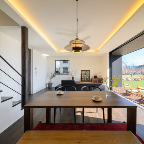 仲良いご家族が望んだ暮らしは、毎日LDKを中心に外とつながる開放感を味わいながら、一緒に食事を楽しんだり、目の前に広がるのどかな景色を日向ぼっこをしながら楽しむことでした。そんな思いをもとに、全開放サッシを開け放つとアウトドアリビングと一体感を生むLDKスペースを中心とした空間を構成しました。また、家事や収納にもこだわり回遊式の家事動線やゆとりのファミリークロゼットを設け、理想の住まいを実現しました。
