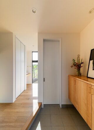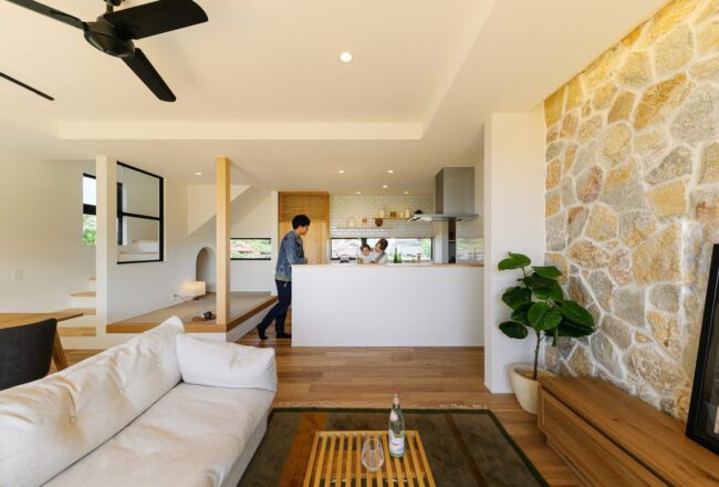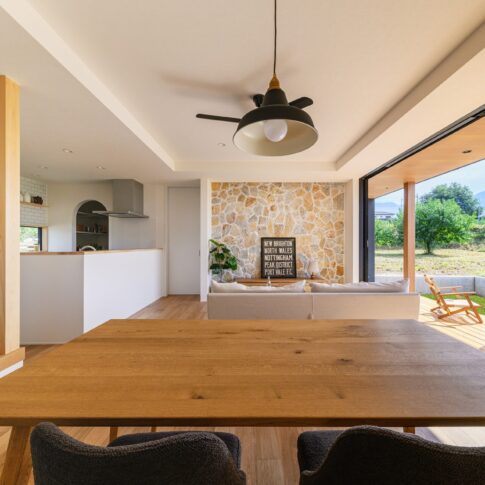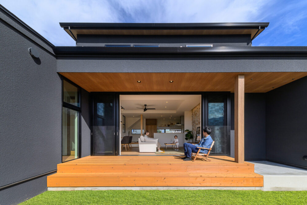 仲良いご家族が望んだ暮らしは、毎日LDKを中心に外とつながる開放感を味わいながら、一緒に食事を楽しんだり、目の前に広がるのどかな景色を日向ぼっこをしながら楽しむことでした。そんな思いをもとに、全開放サッシを開け放つとアウトドアリビングと一体感を生むLDKスペースを中心とした空間を構成しました。また、家事や収納にもこだわり回遊式の家事動線やゆとりのファミリークロゼットを設け、理想の住まいを実現しました。