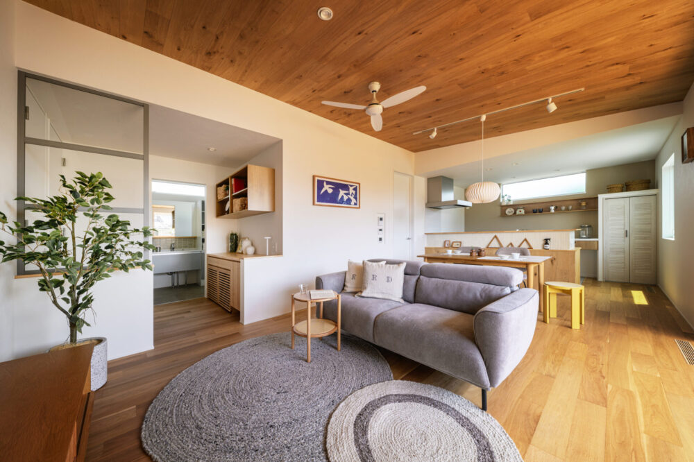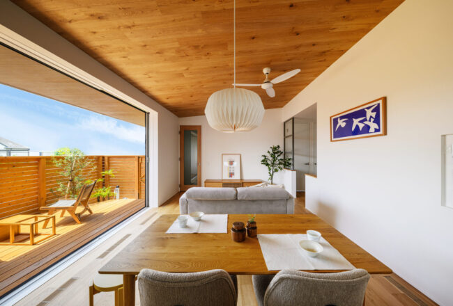 リビングを中心に、東西南北それぞれに外への視線の抜けがあり、光と風が心地好く流れ、視線の先に抜ける青空に、気持ち