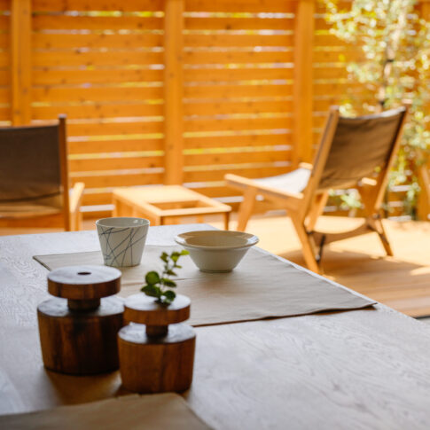 全開放サッシを開け放ち、木製フェンスでプライバシーが保たれたウッドデッキでゆっくりコーヒーを淹れ、ホッとくつろ